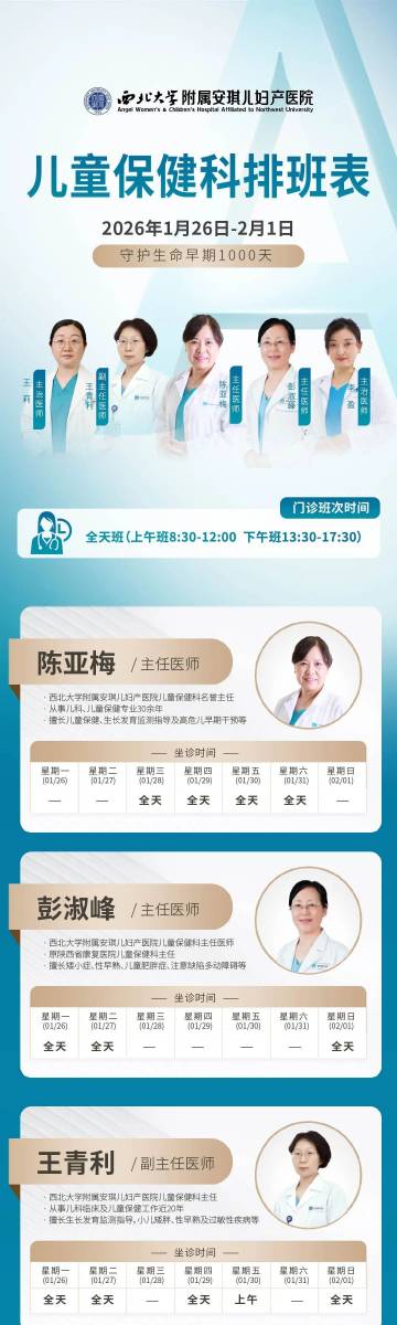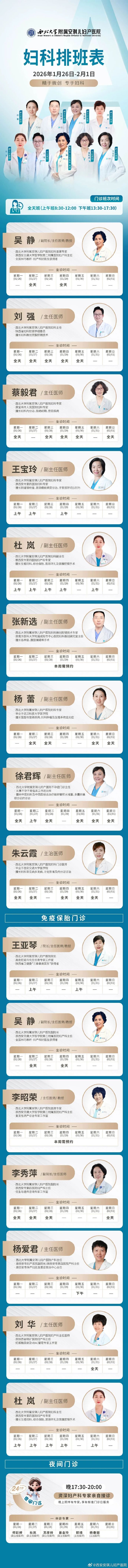 西安安琪儿妇产医院(1月26日至2月1日)专家坐诊时间表
