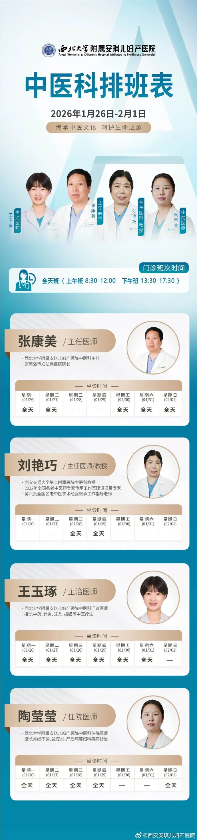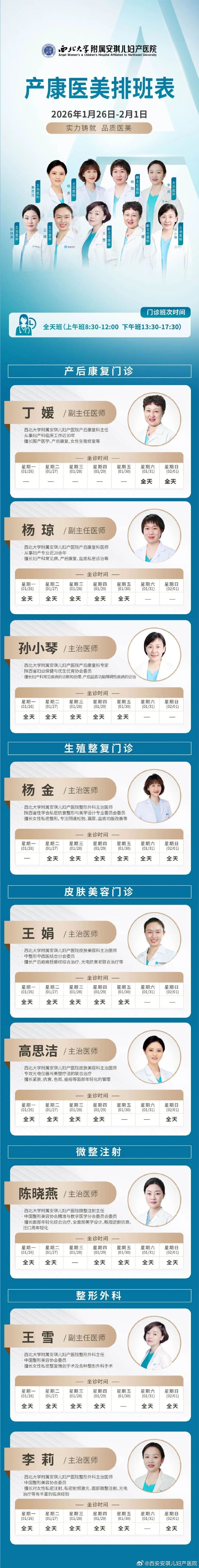 西安安琪儿妇产医院(2025年12月29日至2026年1月4日)专家坐诊时间表